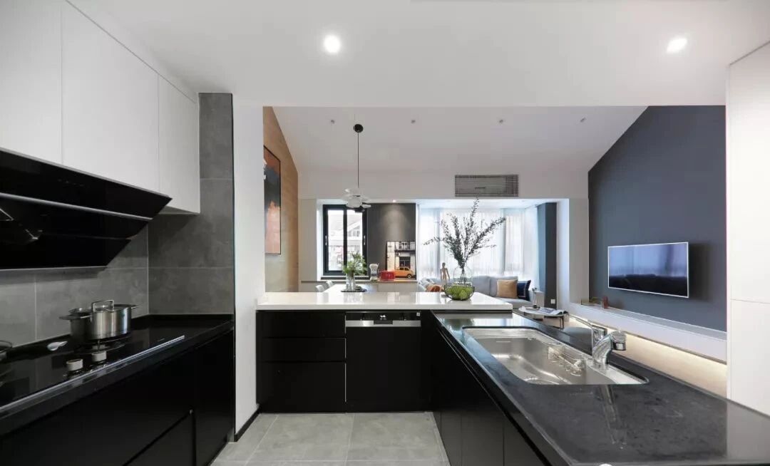 我們設計過很多這樣的案例,用柜子取代砌墻,一個柜子兩面用,既實現(xiàn)一個入戶玄關鞋柜,廚房也多了一組臺面,實現(xiàn)最實用的U型廚房。